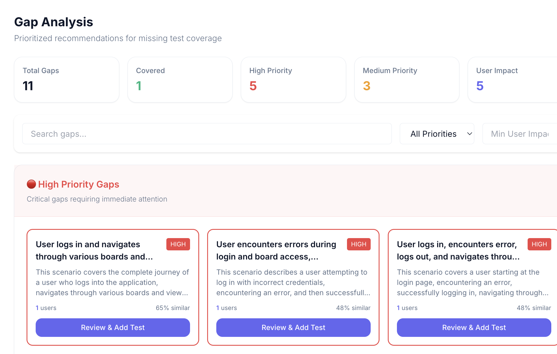 Maps user workflows against your test suite to highlight coverage gaps and ensure comprehensive testing.